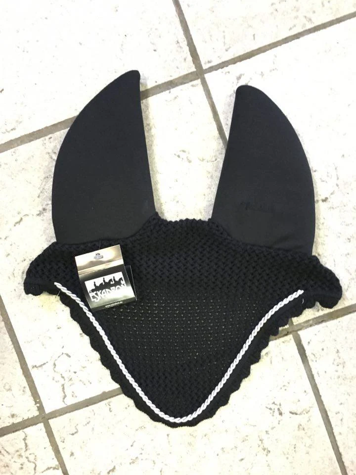 Oreilles doublées néoprène pour atténuer les bruits — Bonnet chasse mouches, au crochet avec oreilles en tissu doublé néoprène. Taille cheval ou poney. Permet que le cheval entende moins les bruits autour. Idéal pour les chevaux nerveux ou peureux en concours. Lavable en machine