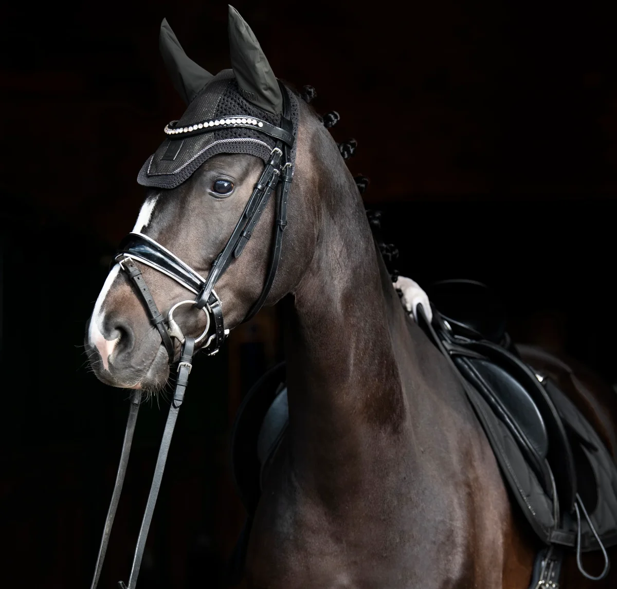 Fly Hood GLITTER MESH SPORT ESSENCE 22/23 fil de coton au crochet nouvelles oreilles softshell innovantes coupe sportive tissu à paillettes insérées avec l’emblème Eskadron élégant cordon lurex Taille Poney Cheval Coloris : Darkolive (vert olive) Black (noir) Dove blue (bleu).