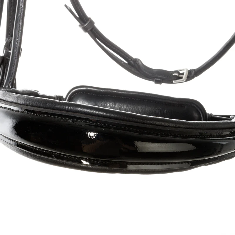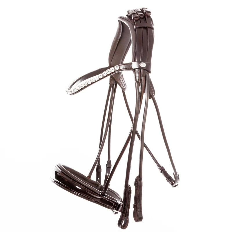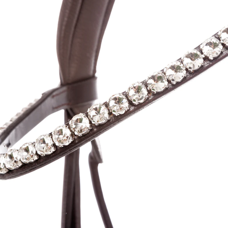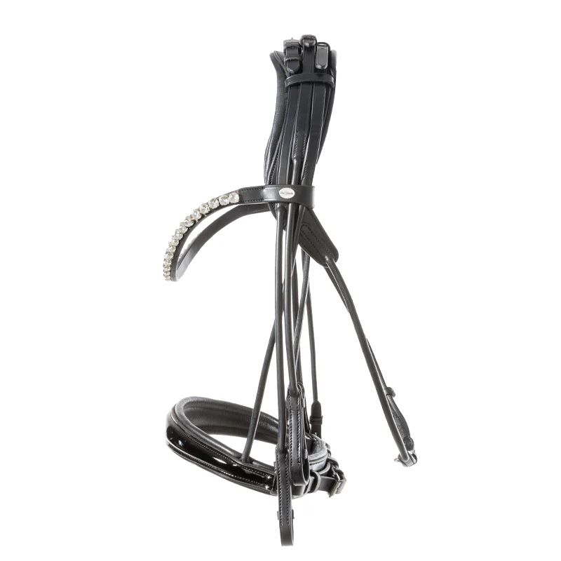 Cette bride de Weymouth, fabriquée en cuir allemand de haute qualité, impressionne par son élégance : les montants cousus ronds, le frontal incurvé avec de grands strass blancs et la muserolle en cuir verni donnent un aspect unique à la bride sur la tête de chaque cheval. La têtière particulièrement anatomique et rembourrée assure un grand confort en même temps.