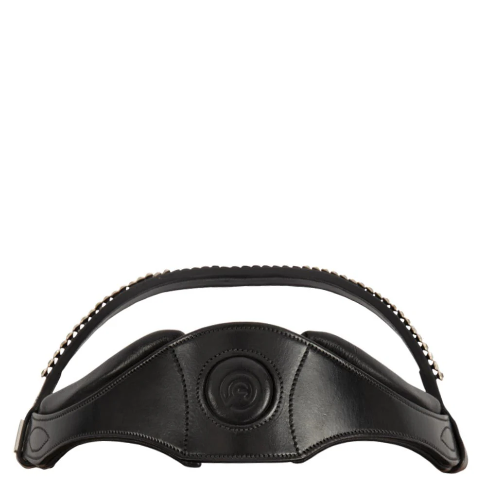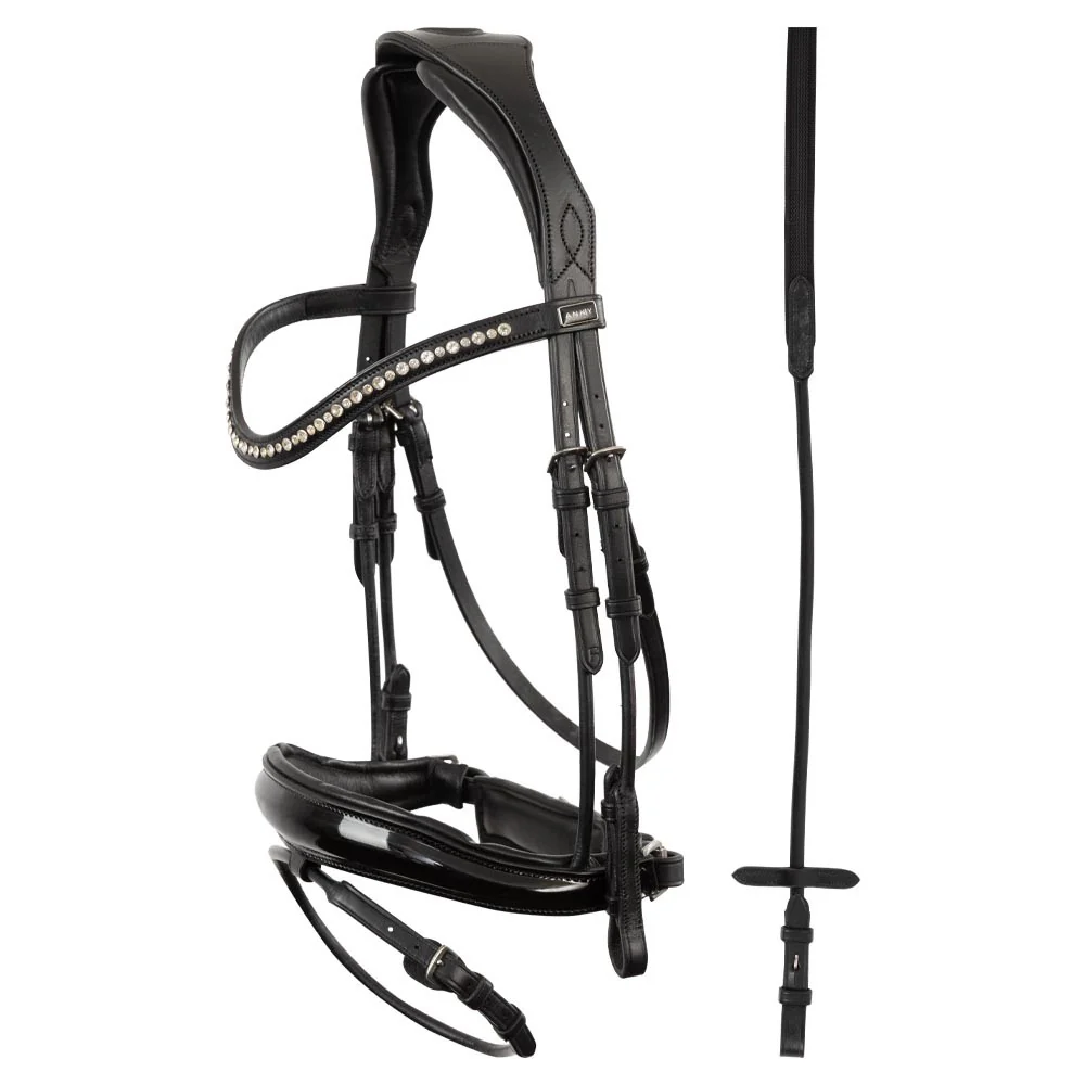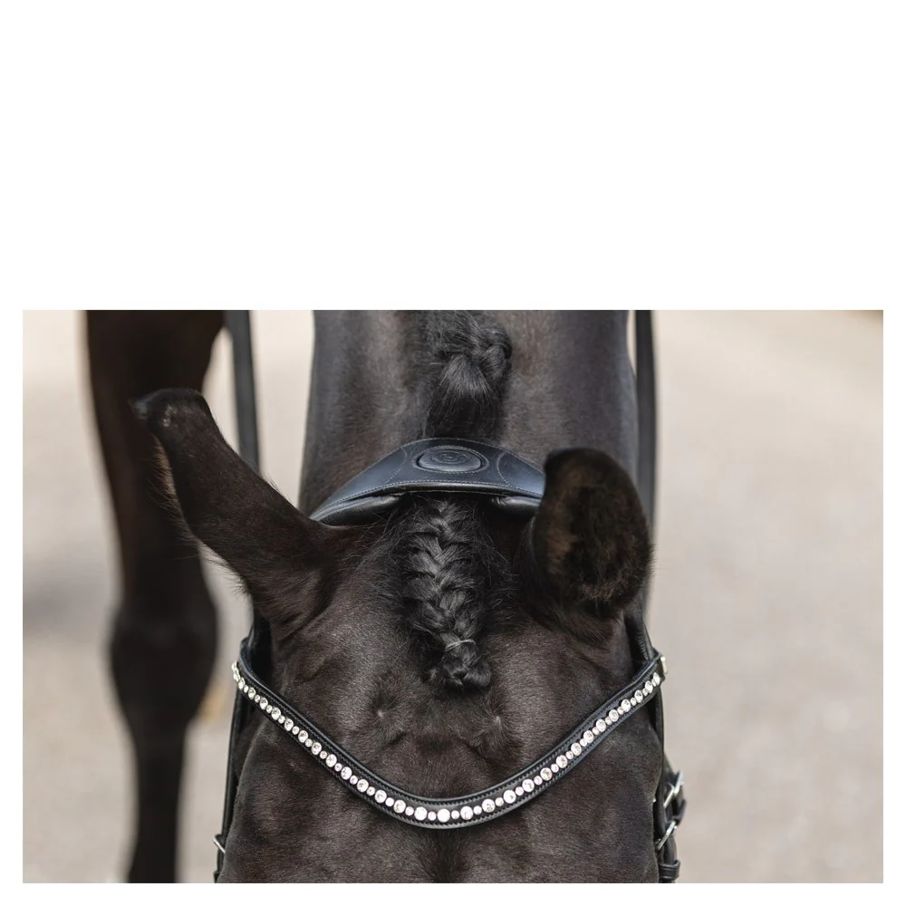 La têtière de forme anatomique est rembourrée de cuir extra-doux et offre une liberté supplémentaire derrière les oreilles du cheval grâce à sa forme ronde et réduit la pression à la tête du cheval. La bride a un frontal incurvé agrémenté de diamants d’imitation Stellux Jet-Black d’Afrique du Sud pour compléter le look glamour.