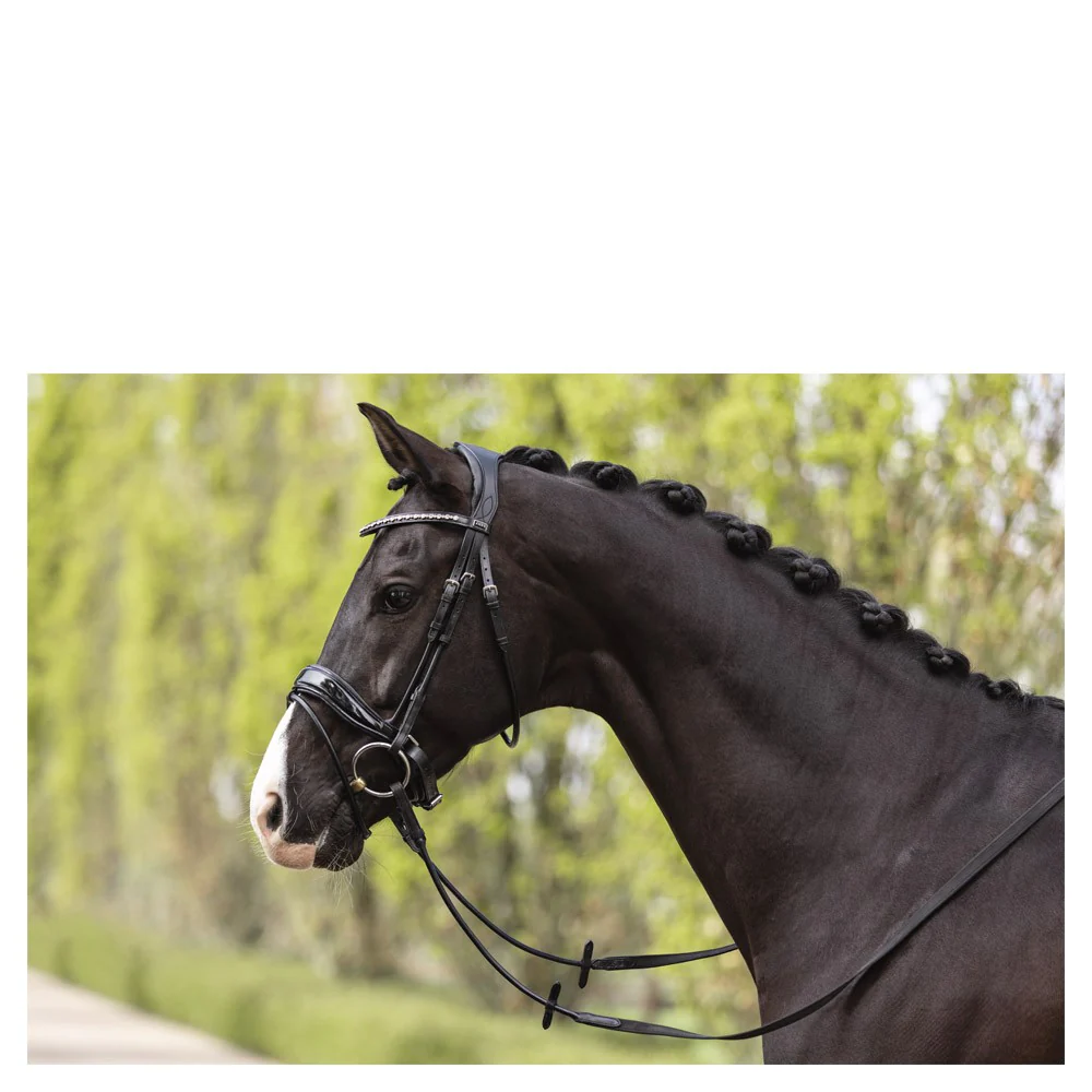 La muserolle pull-back de forme anatomique est en cuir verni et les montants et la sous- gorge sont en cuir cousu rond.
