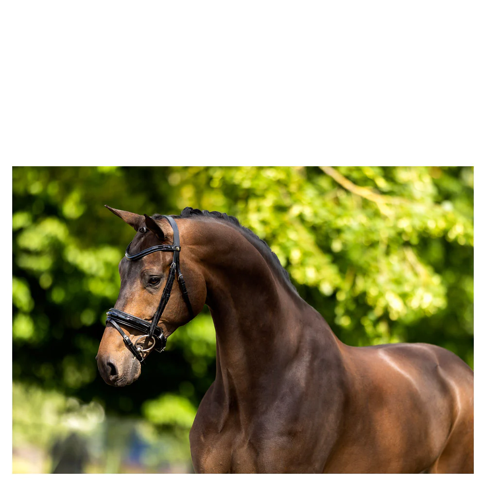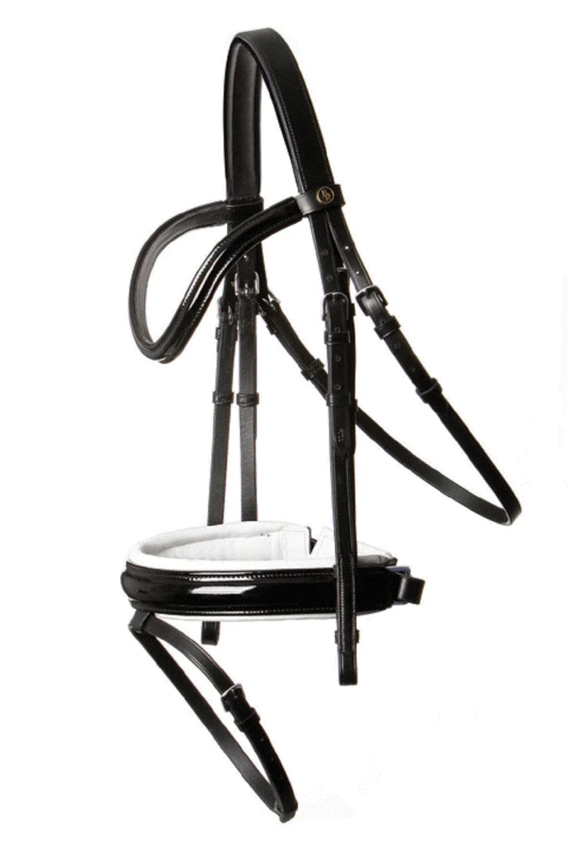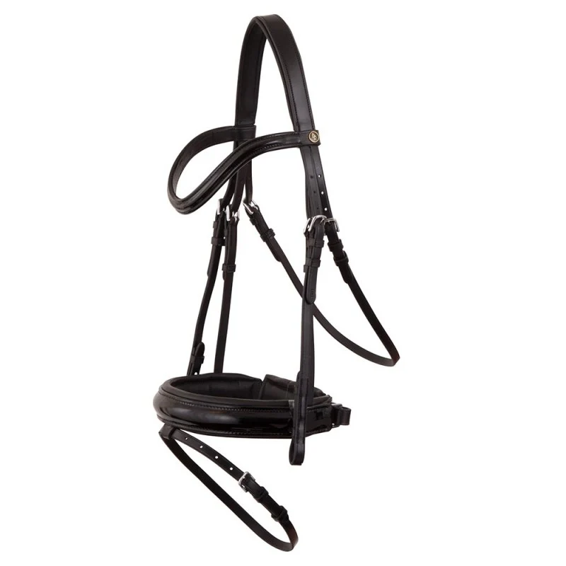 Magnifique bridon en cuir verni Bridon BR Kingston* La têtière est rembourrée et très douce.* Frontal avec forme vague, cuir bombé rond avec cuir verni, doublé de cuir souple.* Muserolle pull-back doublée et cuir bombé rond verni.* Fermetures à crochets. Vendu sans les rênes.