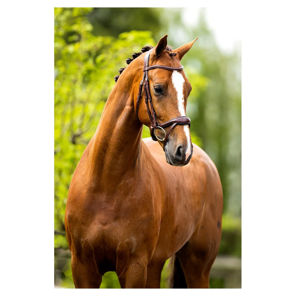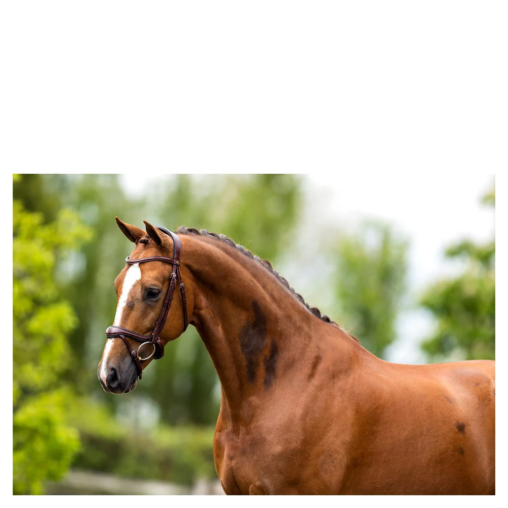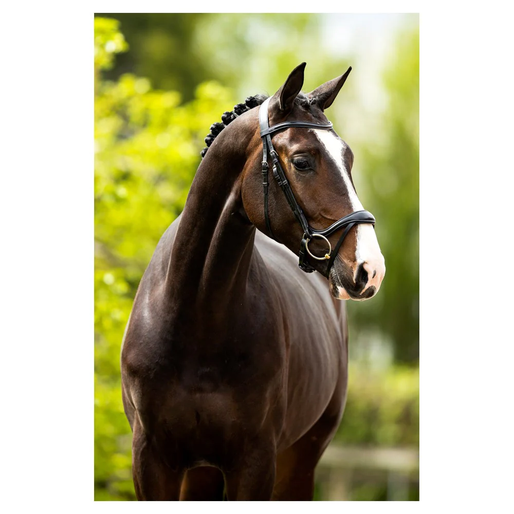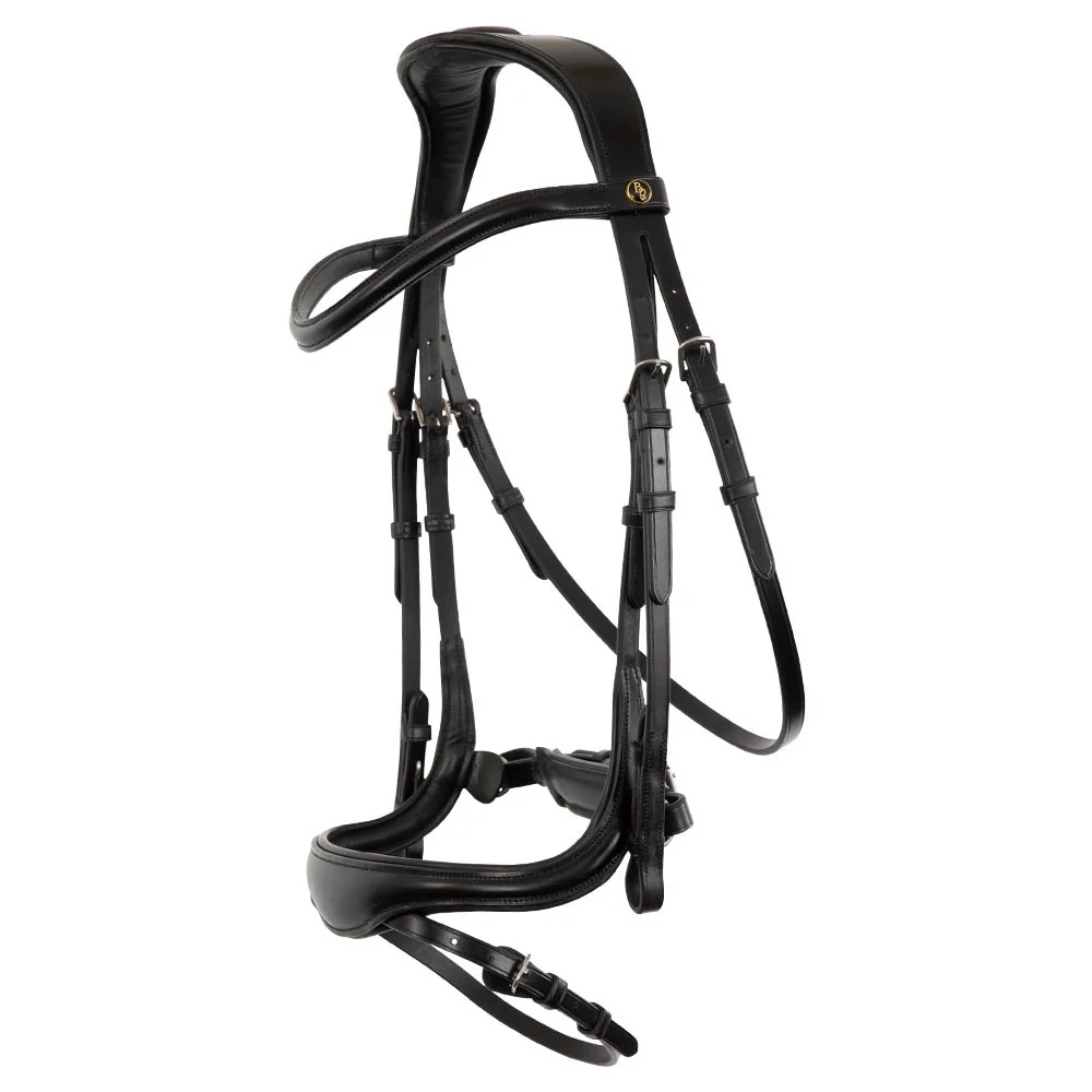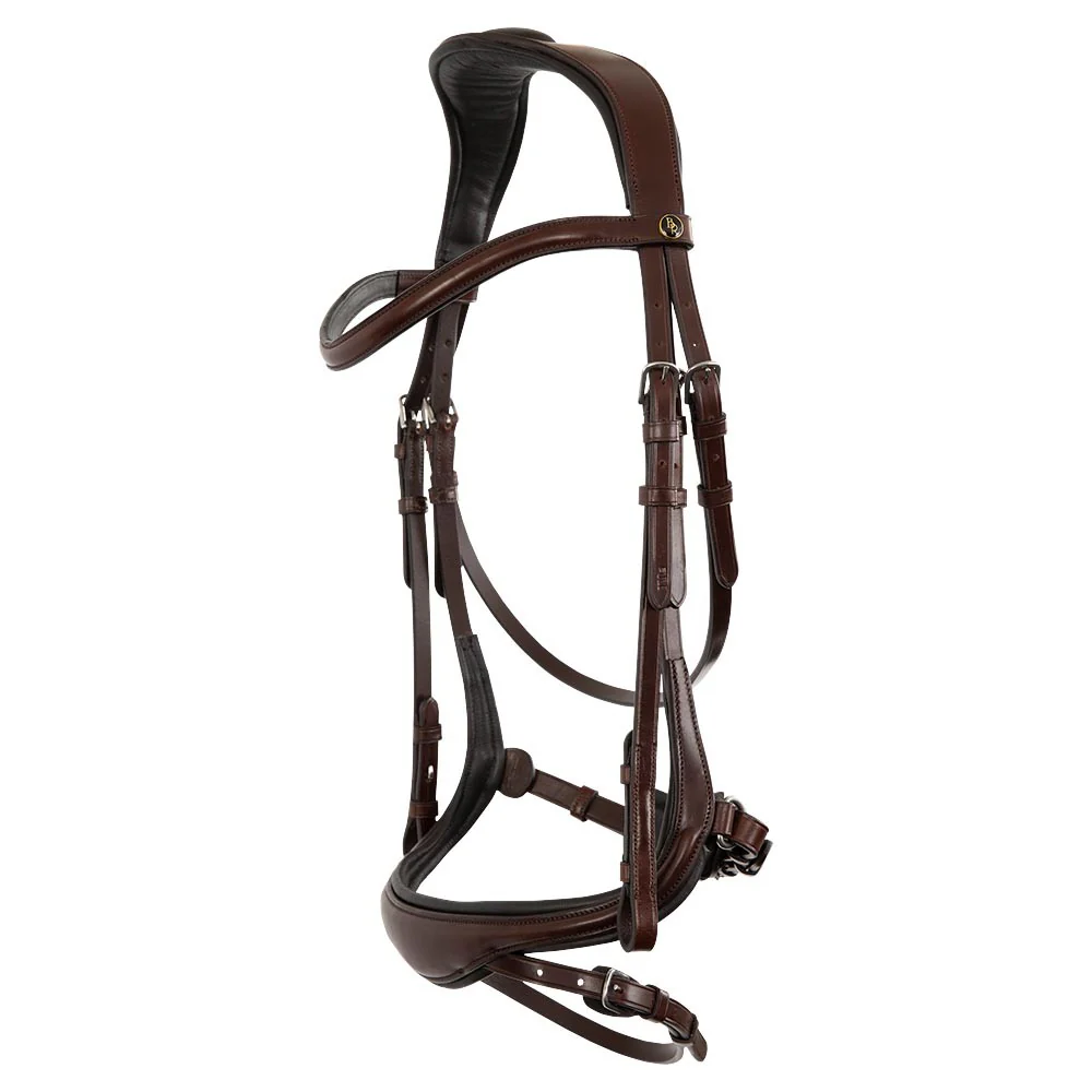 Ce bridon de forme anatomique se distingue par sa muserolle en forme de U et sa têtière large et souple.