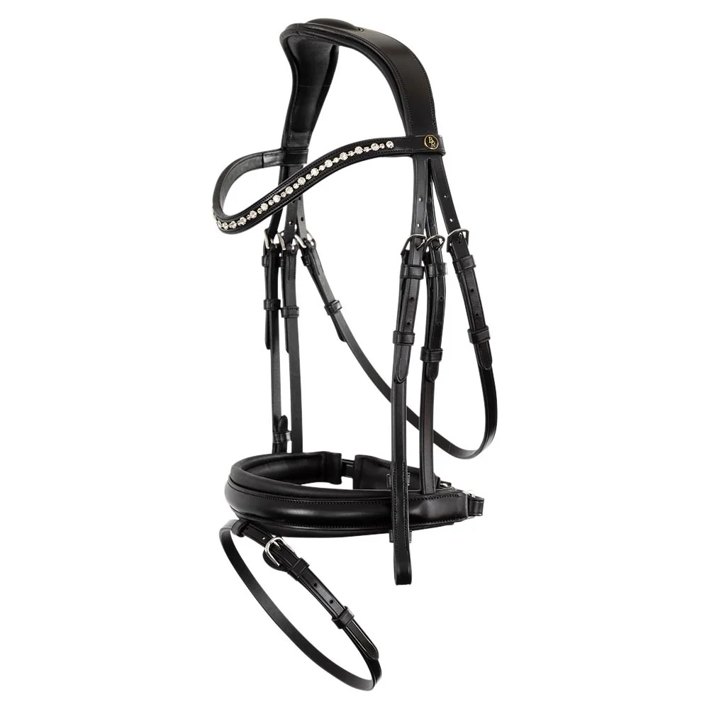 Rembourrage doux et forme anatomique pour offrir à votre cheval la bride la plus confortable possible et un frontal rayonnant avec de luxueux cristaux Stellux™ : c’est le bridon BR Lynton!