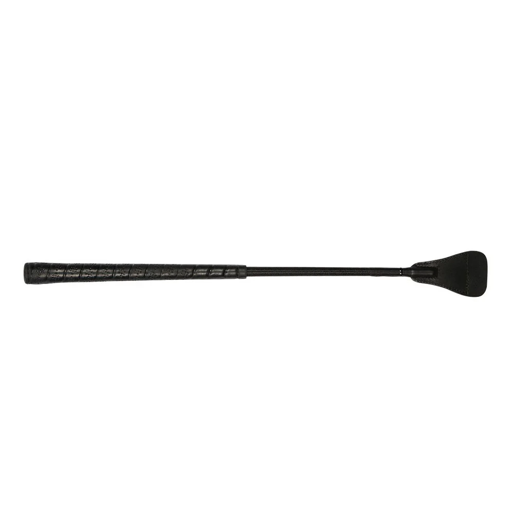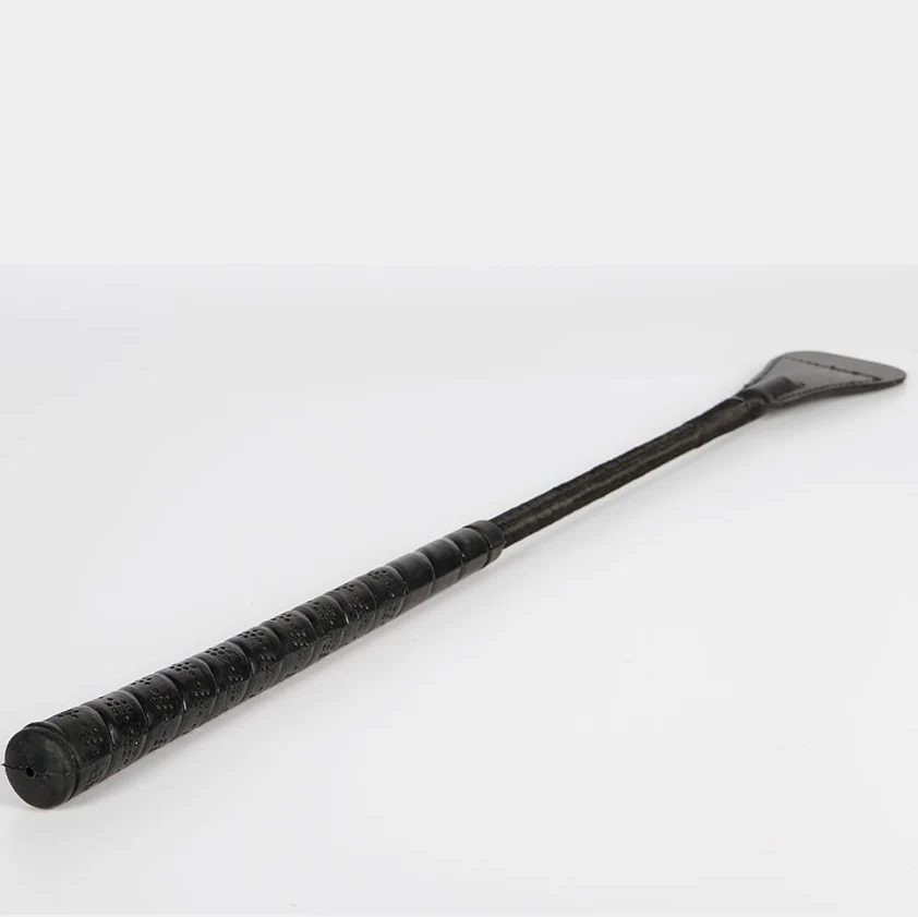 Cravache de saut de luxe en nylon finement tressé avec poignée caoutchouc type club de golf et claquette large en cuir noir. 55 cm.