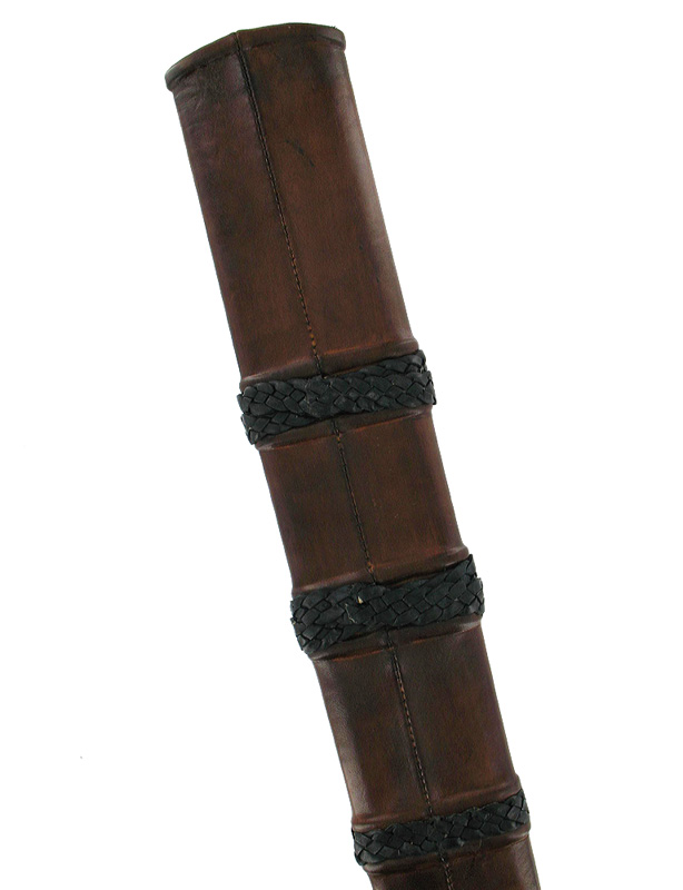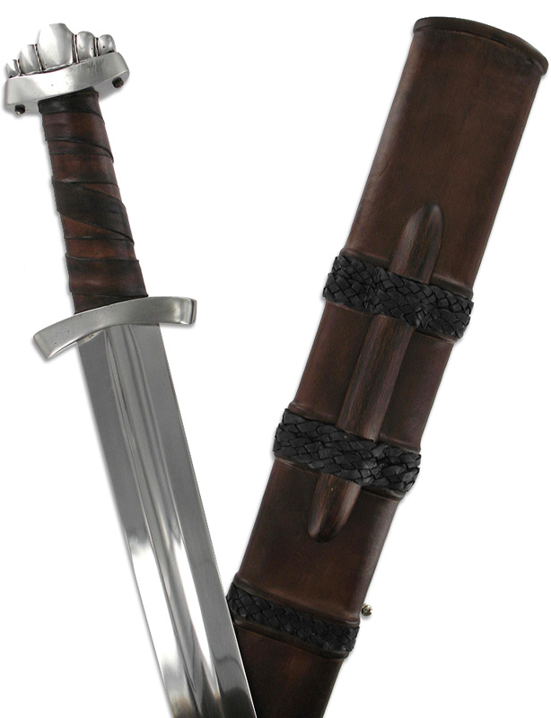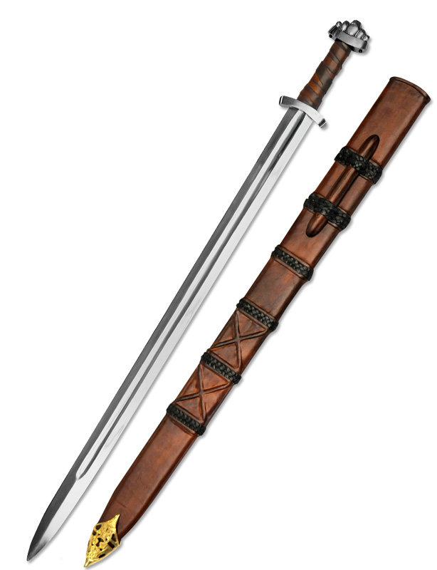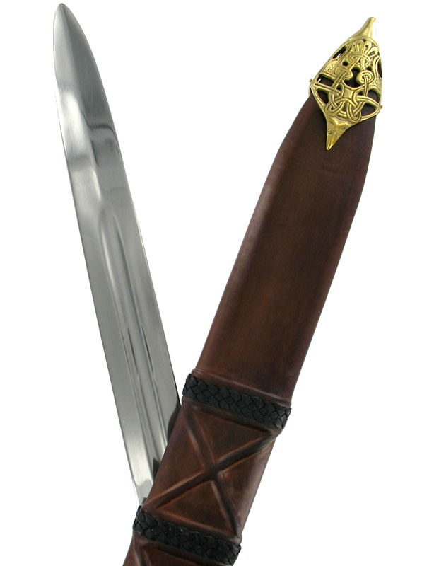 Le fourreau en bois et cuir souple brun, tressé de cuir noir et orné d’entrelacs en métal doré, met en valeur la noblesse de la lame. Son attache porte-épée en bois et cuir permet un port à la ceinture à la manière des guerriers celtes. La poignée gainée de cuir brun assure une prise ferme et confortable, tandis que le pommeau en acier poliéquilibre parfaitement l’ensemble.