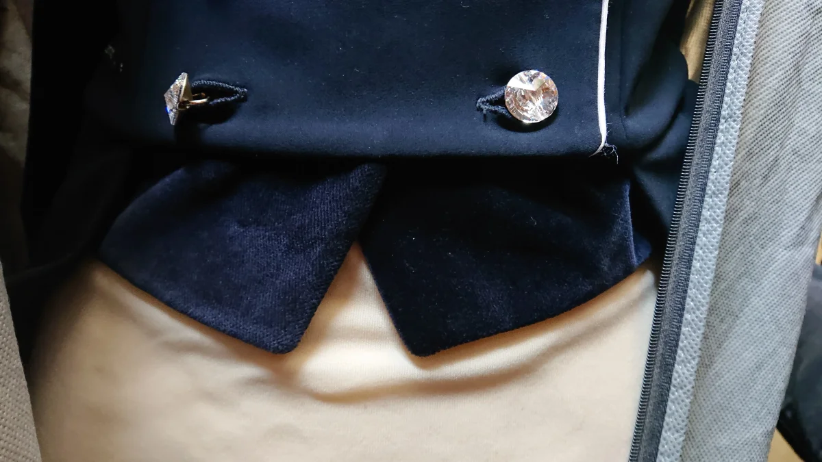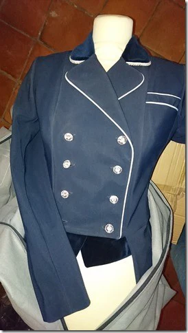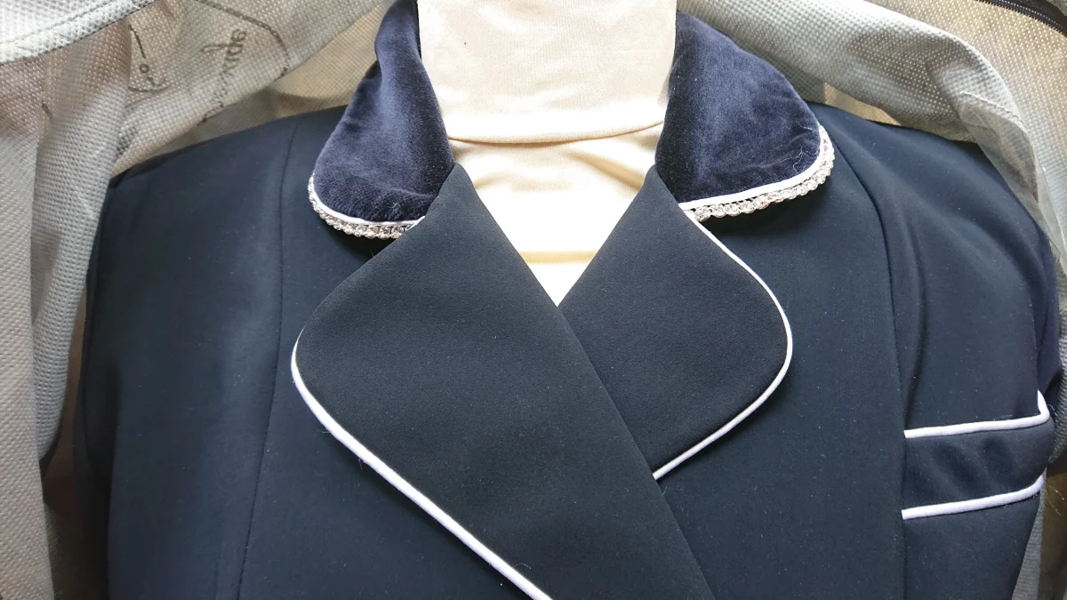 Frac Lamantia Couture en tissu Softshell bleu nuit avec détails velours et bordure blanche et stras