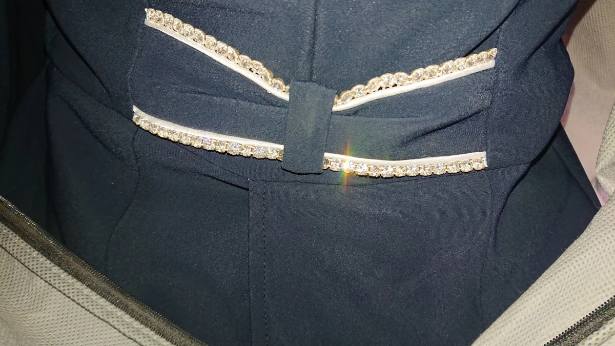 Frac Lamantia Couture en tissu Softshell bleu nuit avec détails velours et bordure blanche et strass