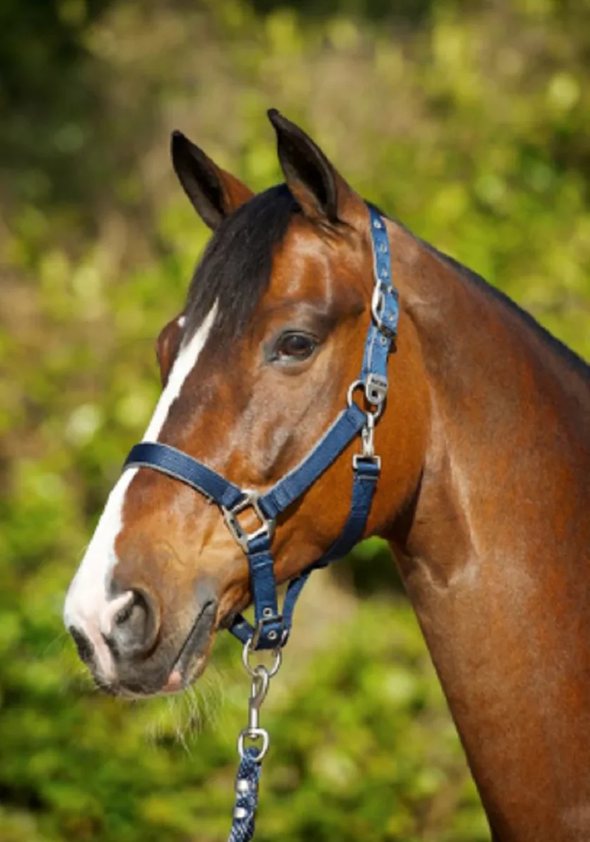Solide et élégant — Joli licol en nylon avec solide bouclerie satinée. Doublure suédine sur la muserolle, la têtière et les montants. Fermeture de la sous-gorge par mousqueton des 2 côtés. Vendu avec sa longe assortie.