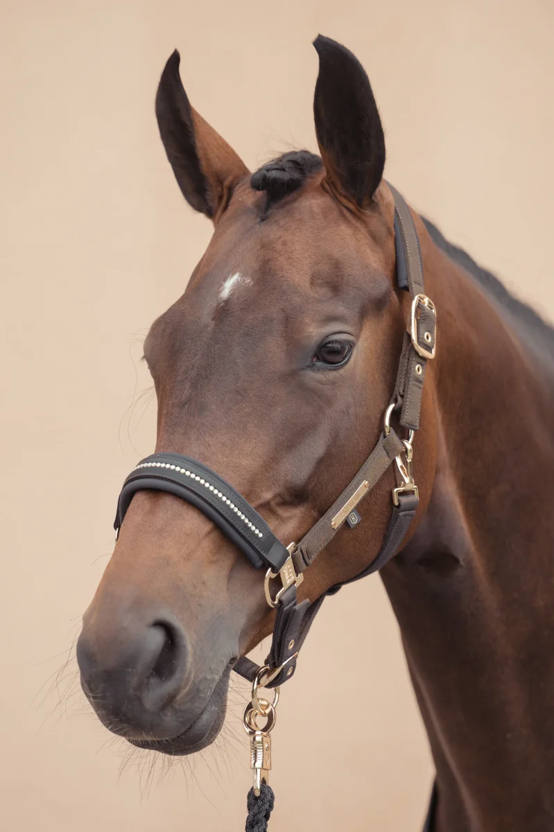 - Strass incrustés: Des cristaux dorés insérés dans la muserolle pour ajouter une touche de glamour.