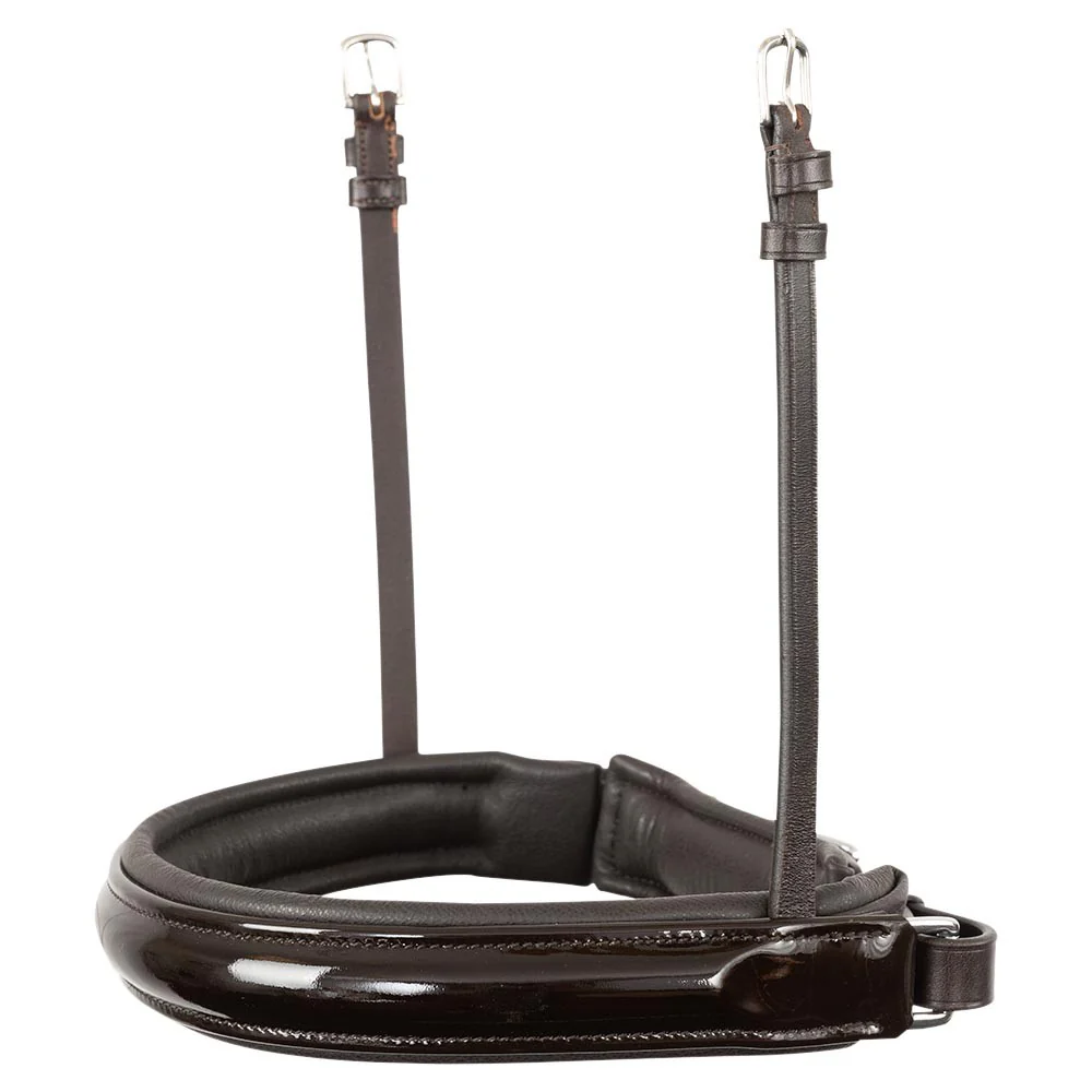 Muserolle pull-back large, (4 cm) cuir laqué. La muserolle a un design symétrique doublée de cuir souple et pourvue de protection de sous-barbe. Bouclerie ronde, brillante et argentée.