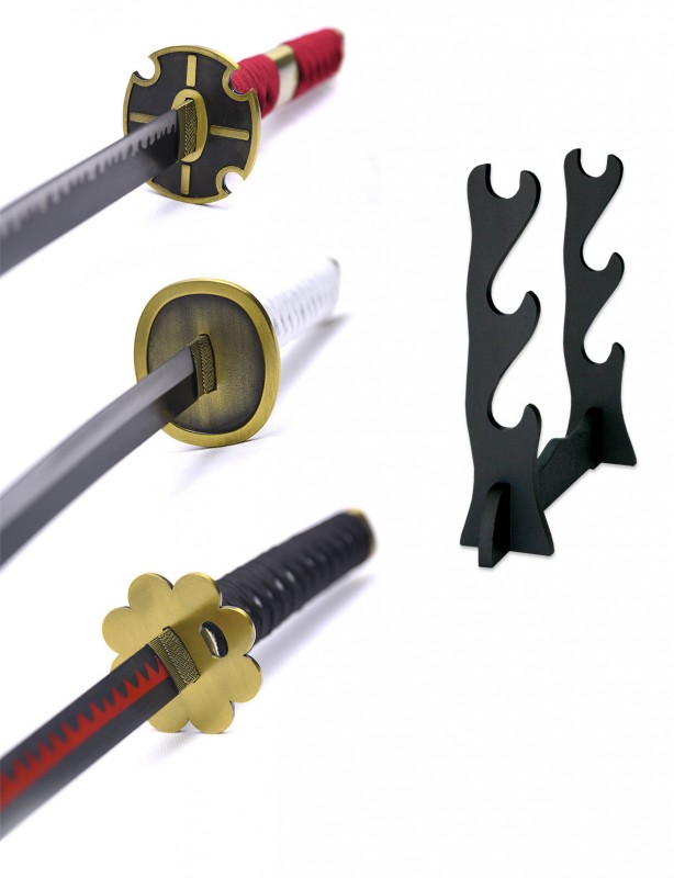 Conçus en acier inoxydable non tranchant, ces katanas sont parfaits pour la décoration intérieure ou pour compléter une collection d’armes de manga. Chaque pièce est finement détaillée, du tressage du manche à la finition du saya, et fournie avec un support 3 places noir mat pour une présentation élégante et ordonnée.