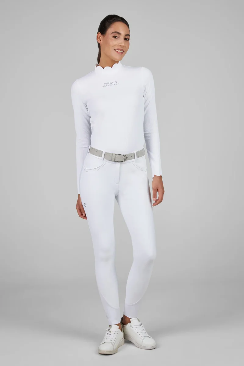Son design raffiné est sublimé par des détails en strass discrets (poches, couture latérale), un motif sérigraphié “Selection” au niveau des chevilles et un look mat ultra-moderne. Une pièce idéale pour les cavalières exigeantes, que ce soit à l’entraînement ou en concours.