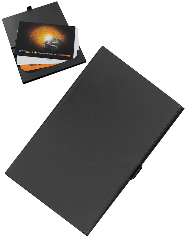 Porte-carte de visite ou de crédit en métal de couleur noire, à personnaliser (gravure laser blanche). Existe également en gris, bleu, rose et vert.