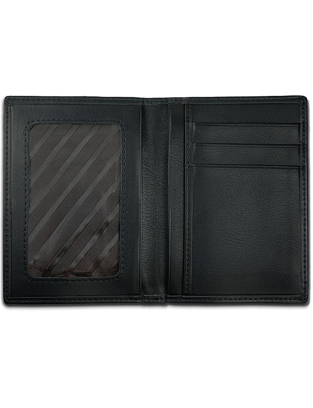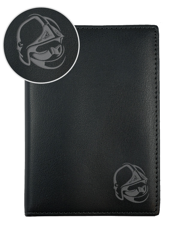 Porte-papier en cuir noir, avec casque de pompier gravé au laser dans notre atelier. Une création Histophile©.