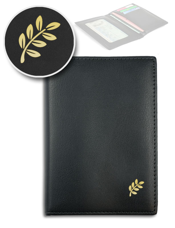 Porte-papiers en cuir noir, avec Branche d’acacia dorée.