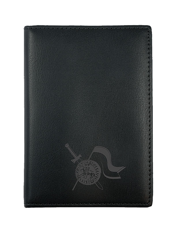Porte-papiers en cuir noir avec couverture gravée : sceau templier, baussant et épée.