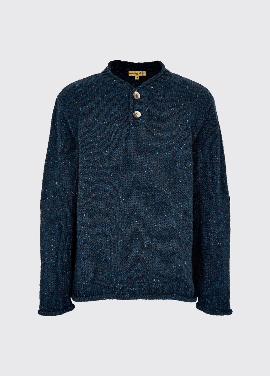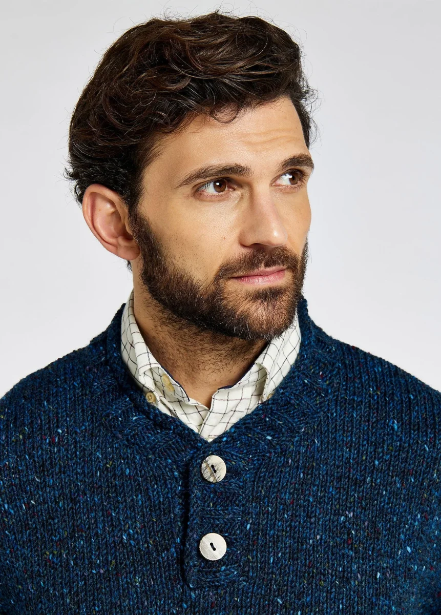 Véritable pièce maîtresse du savoir-faire irlandais, le fil de ce pull robuste a été filé à Donegal et présente de jolis flocons caractéristiques dans la laine. Le col en V, avec une large bordure côtelée et un encolure roulée, est agrémenté de boutons classiques en corne, lui conférant une allure traditionnelle et de qualité. Vêtement vraiment remarquable, il est parfait pour un week-end ou à superposer sous une veste cirée pour un combo gagnant, même par les intempéries les plus rudes.