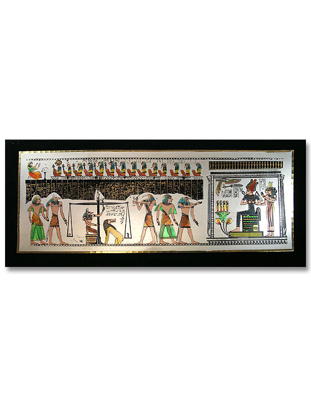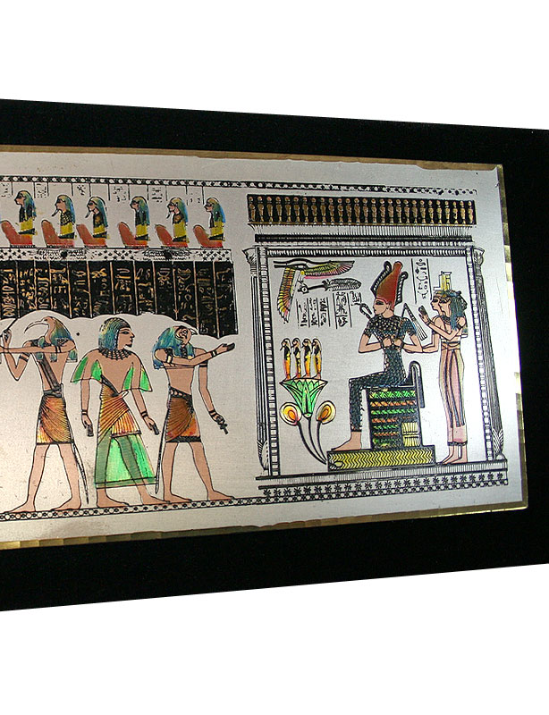 Tableau en cuivre peint représentant la pesée de l’âme (psychostasie). Ce détail est inspiré du Livre des morts de Hounefer. Ce papyrus est aujourd’hui conservé au British Museum (Londres, Angleterre)