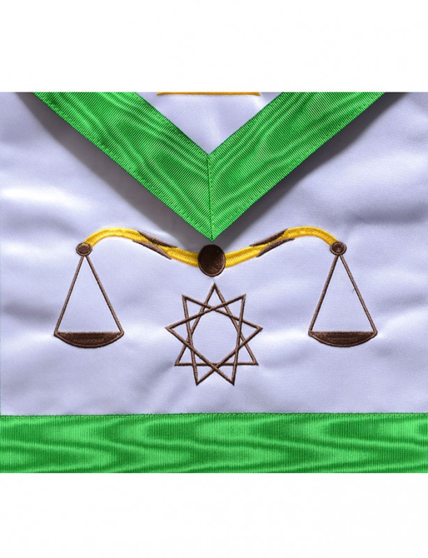 Tablier 8ème Degré. Rite Écossais Ancien Accepté Objet: Tablier Matière: Satin Dimension: 29,9cmx34,9cm. Couleur: Vert . Dos: Vert avec poche.