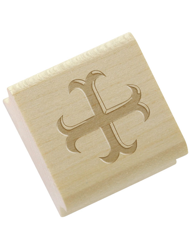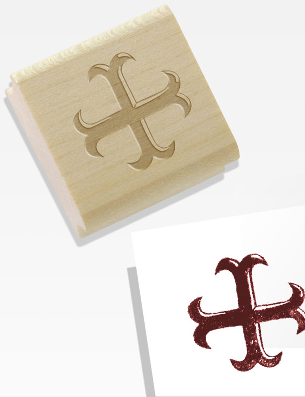Tampon encreur « croix cathare ». Gravure du motif sur le dessus du tampon (facilite l'orientation). Création et réalisation Histophile.